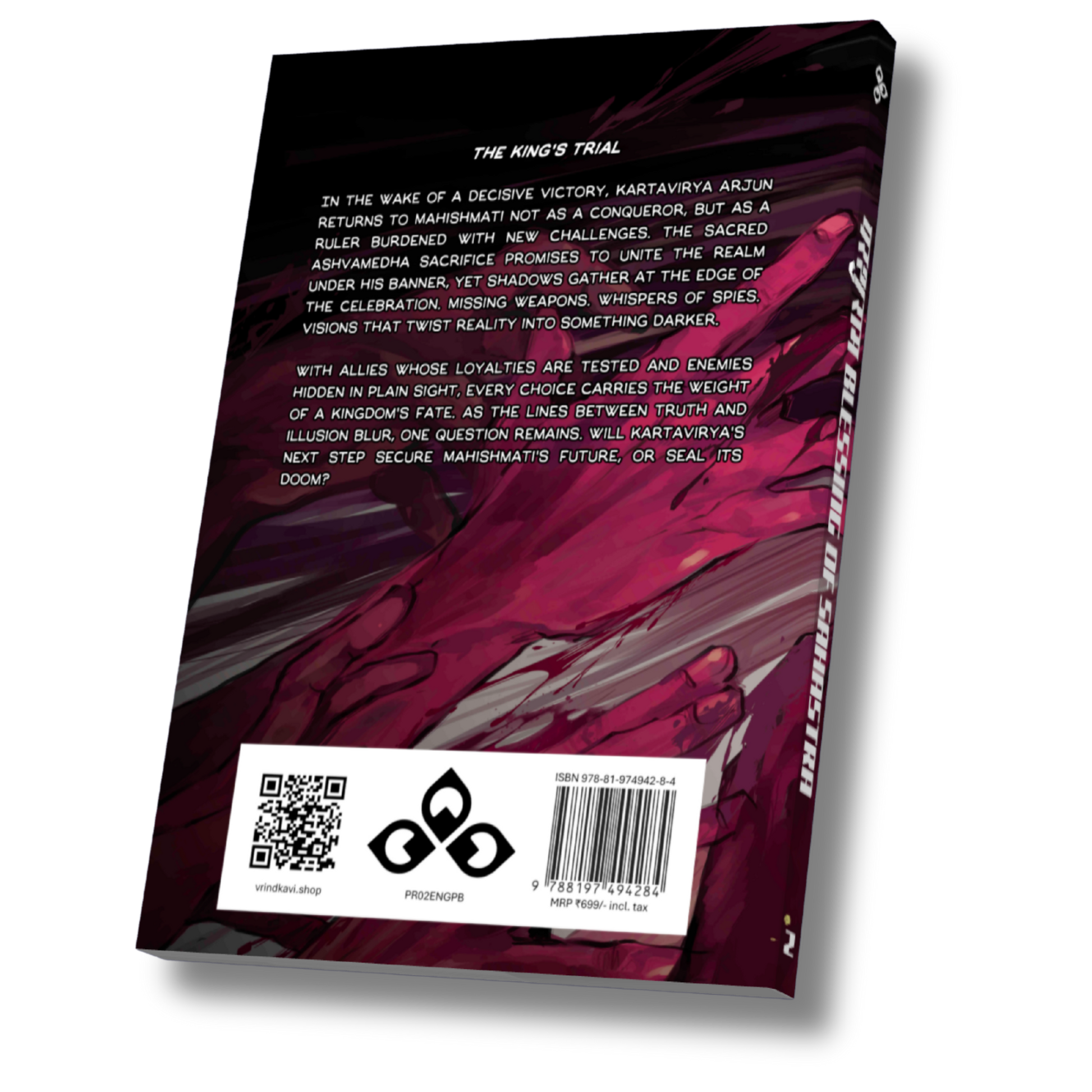 In these pages, you will journey alongside Kartavirya Arjun – a young king, fierce warrior, and heir to a great legacy – as he embarks on the sacred Ashvamedha sacrifice, a ritual that could unite the land under his rule. But triumph breeds envy, and enemies are never far. As sabotage, treachery, and haunting visions close in, Kartavirya must decide who to trust before the kingdom he swore to protect tears itself apart.